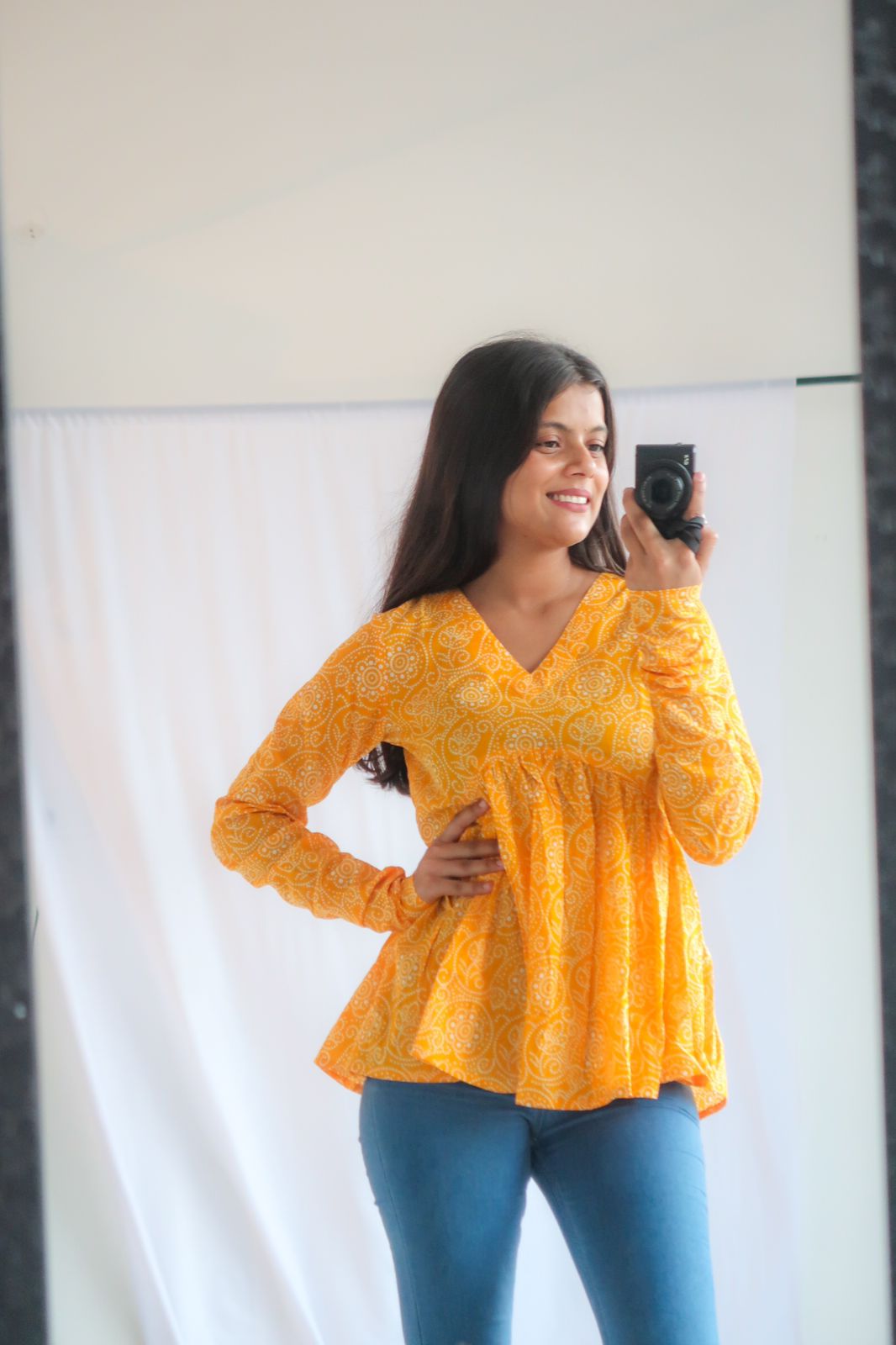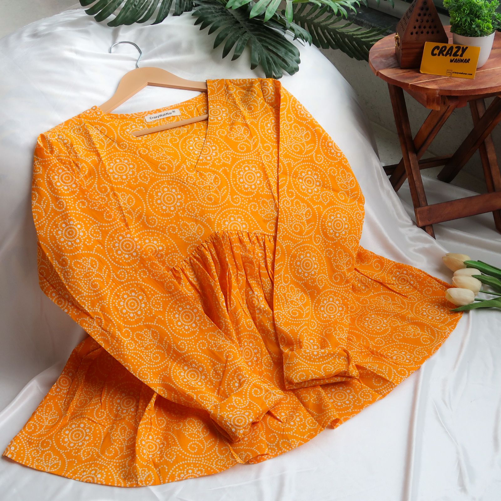 Brighten up your wardrobe with our Barbie Churidar Short Kurti, designed to blend traditional allure with contemporary style. Crafted from soft, breathable cotton, this kurti showcases a cheerful mango yellow base adorned with intricate white bandhni prints. The flattering V-neck and churidar sleeves enhance its classic appeal, while the pleated detailing above the waist adds a delightful flare.