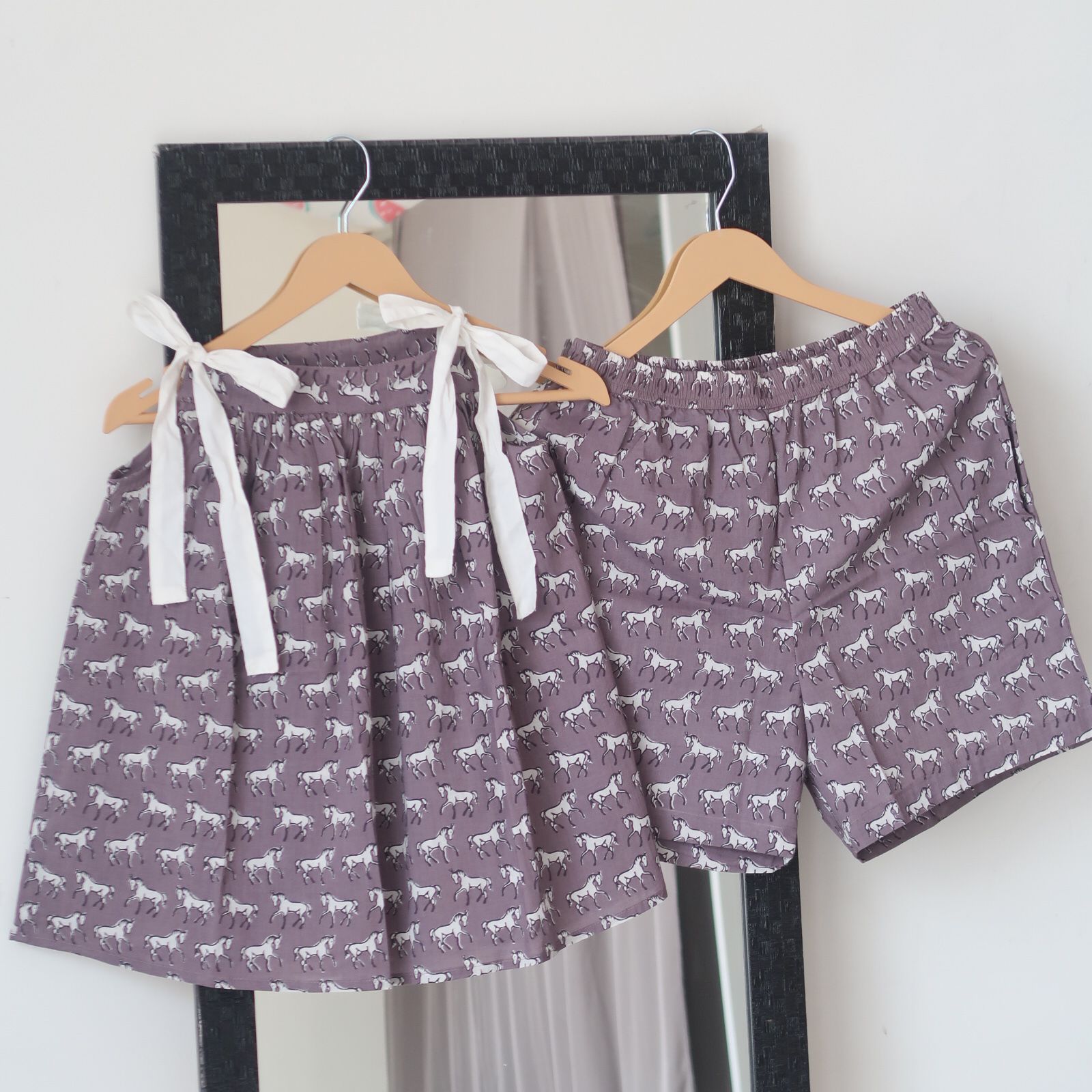 Paired seamlessly with matching shorts in the same dark grey hue and adorned with the delightful white horse print, this set ensures a cohesive and stylish ensemble. Practicality meets fashion with side pockets in the shorts, offering convenience without compromising on aesthetics.