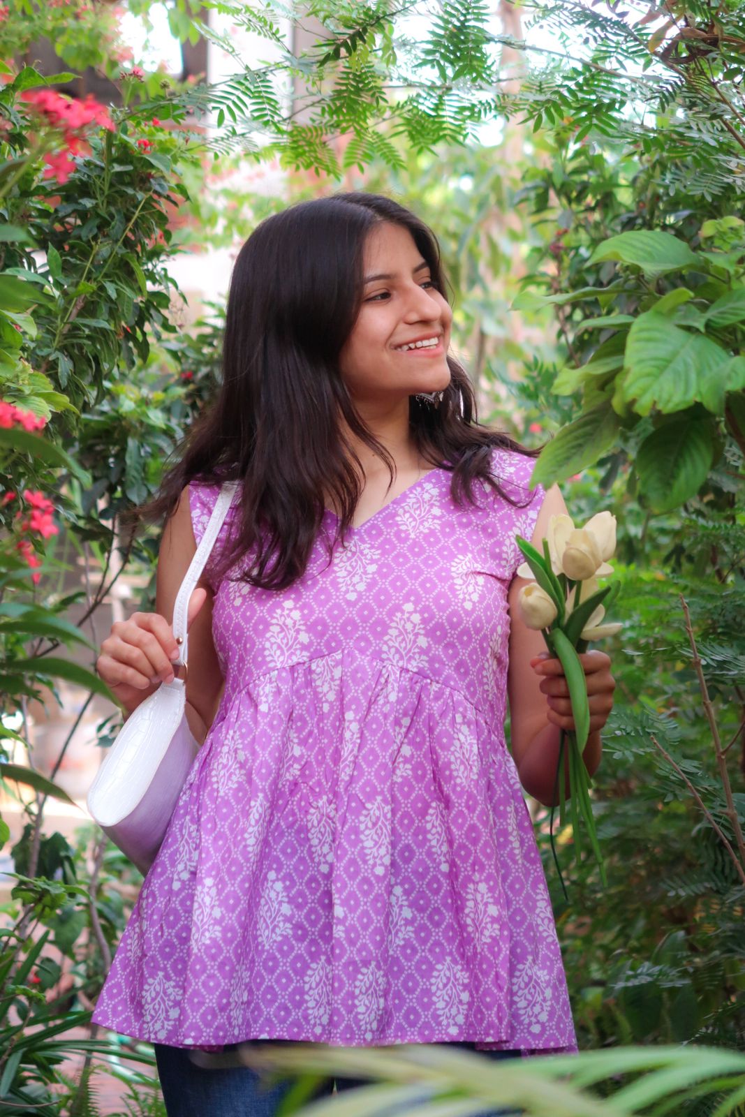 Introducing our ethereal Sleeveless Peplum Top, a true ode to summer romance. Crafted from pure cotton, its soothing lavender base sets the stage for a whimsical display of delicate white floral motifs, evoking the essence of a tranquil garden in full bloom. The alluring V-neck style neckline adds a touch of allure, framing your neckline with grace and elegance. Slip into this enchanting top and feel the soft, breathable fabric caress your skin, ensuring utmost comfort on even the warmest of days.