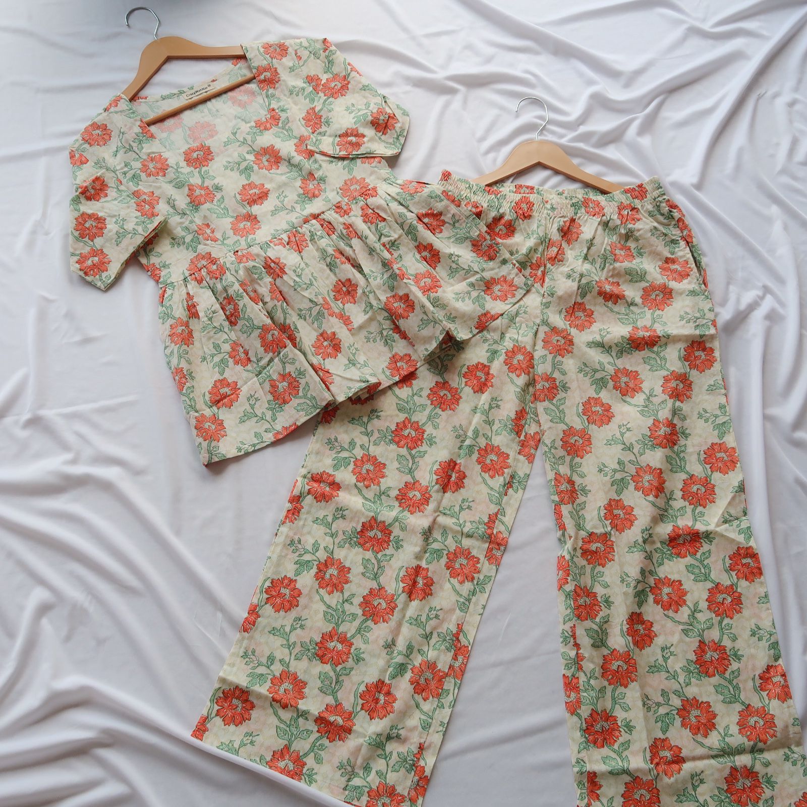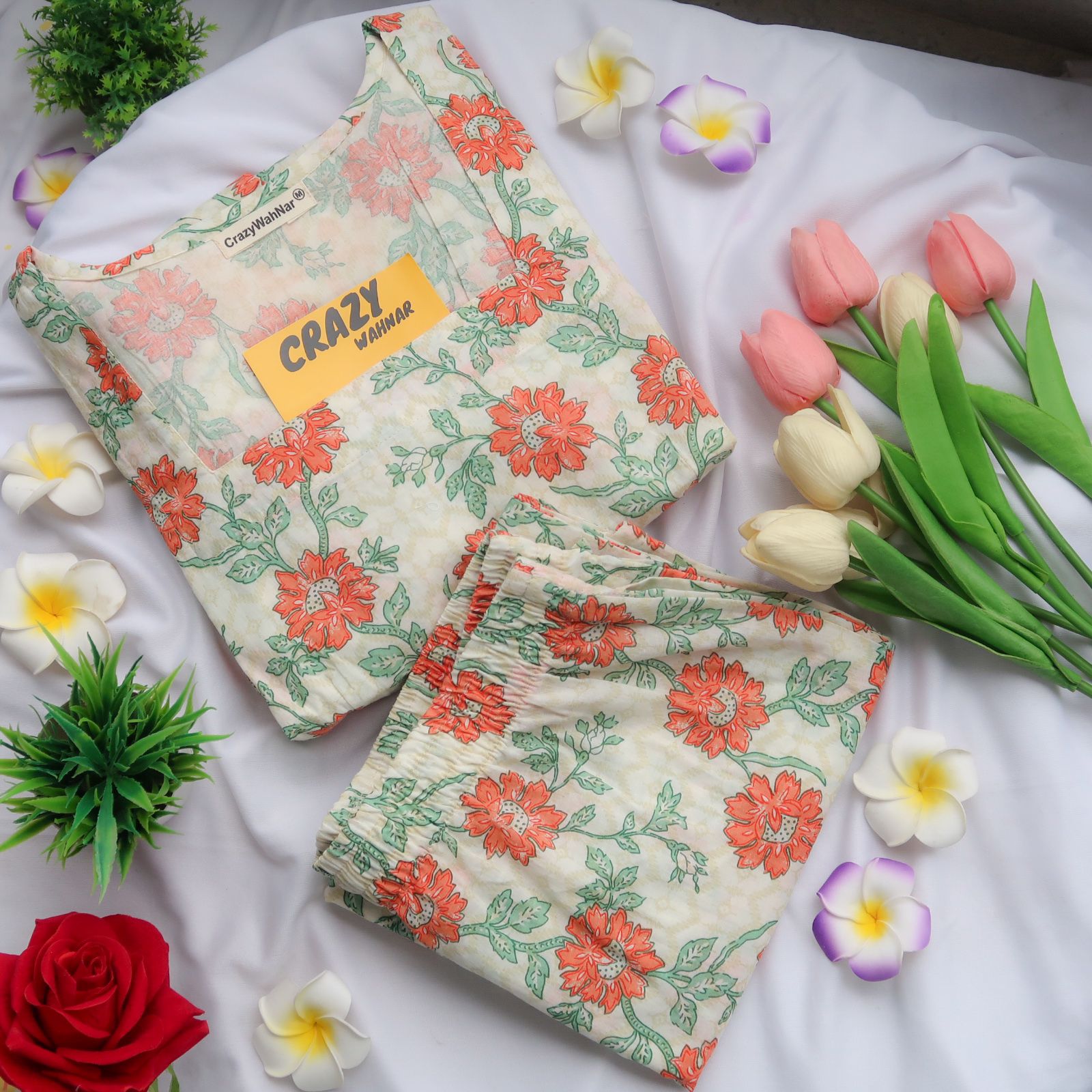 Matching perfectly with the top, the wide-leg pants mirror the same off-white base adorned with the lively orange florals and green leaves print. Made from pure cotton for ultimate comfort, these pants are not only stylish but practical with pockets on both sides.