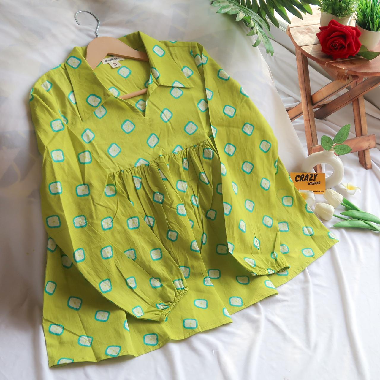 Introducing our "Lime Luxe Mirage" Cotton Short Peplum Top – a vibrant and enchanting piece that effortlessly blends contemporary flair with timeless elegance. The top features a lively lime green base adorned with off-white stone motifs, each delicately outlined in a captivating blue border, creating a mesmerizing visual feast.