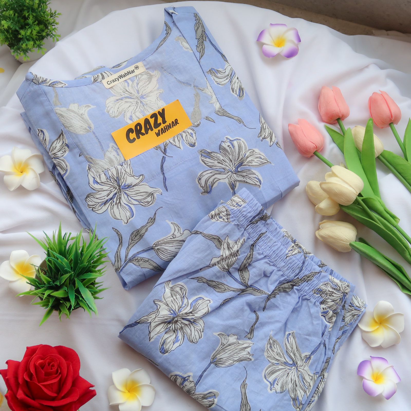 Step into a garden of elegance with this enchanting co-ord set, where every detail blooms with delicate charm and refined grace. The top, fashioned from pure cotton in a serene light blue hue, features a square neckline and half sleeves for a timeless silhouette. Adorned with scattered off-white flowers and greyish leaves, it evokes a sense of tranquility and natural beauty. Frills cascade from the upper waist, adding a touch of whimsy, while side slits enhance movement and modernity.