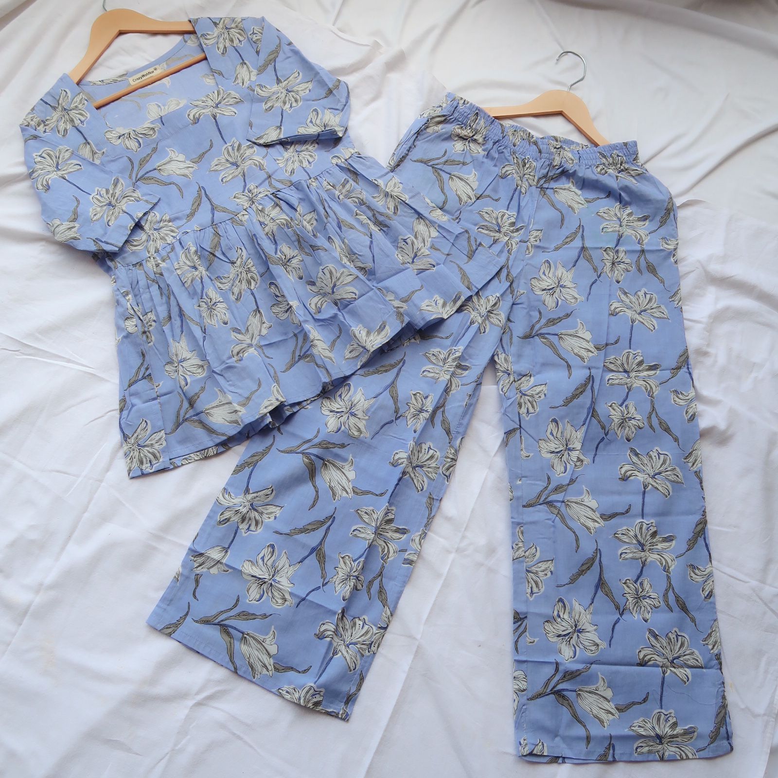 Echoing the top's botanical motif, the wide-leg pants offer a seamless match in the same light blue cotton adorned with off-white flowers and greyish leaves. Designed for comfort and style, these pants boast pockets on both sides, combining practicality with effortless elegance.