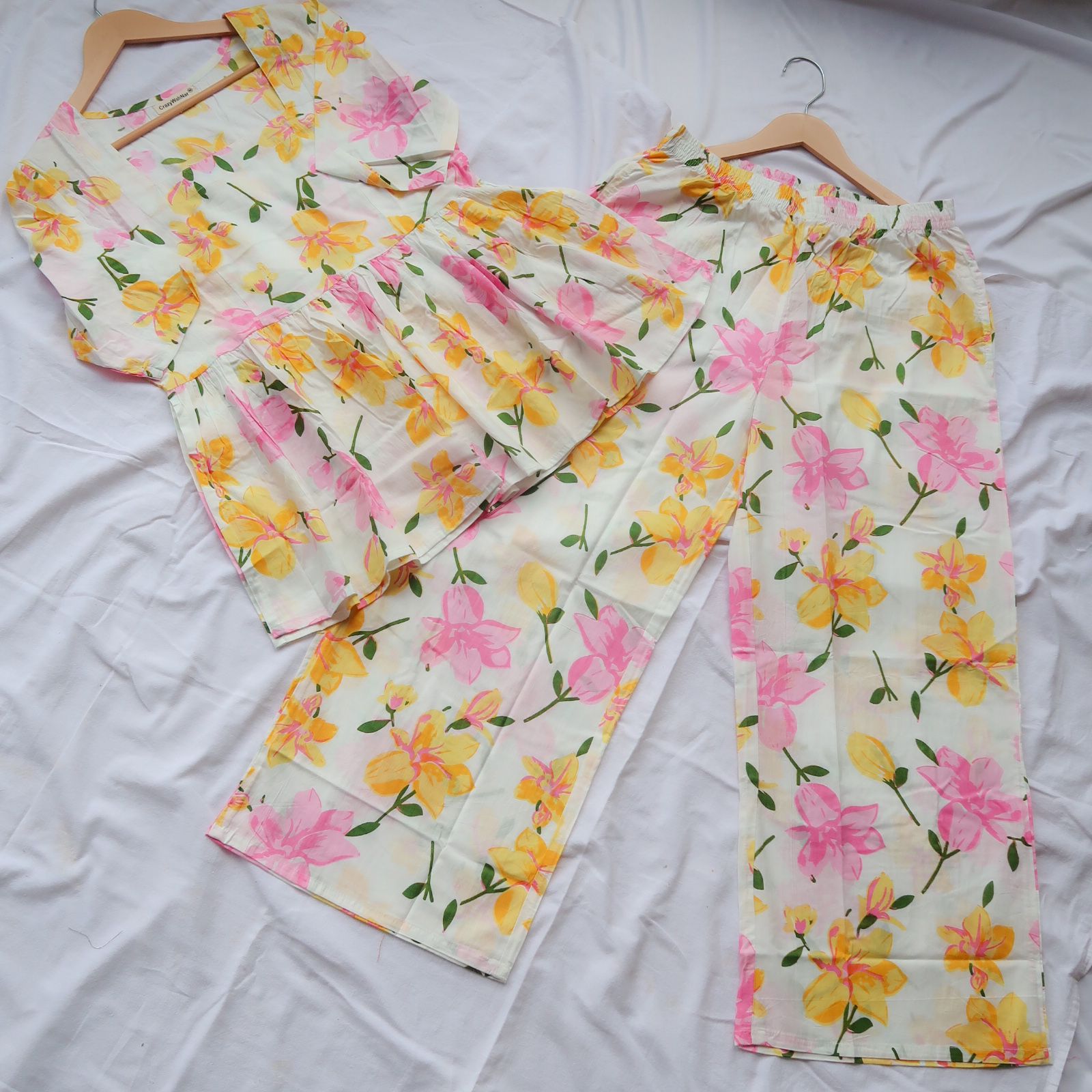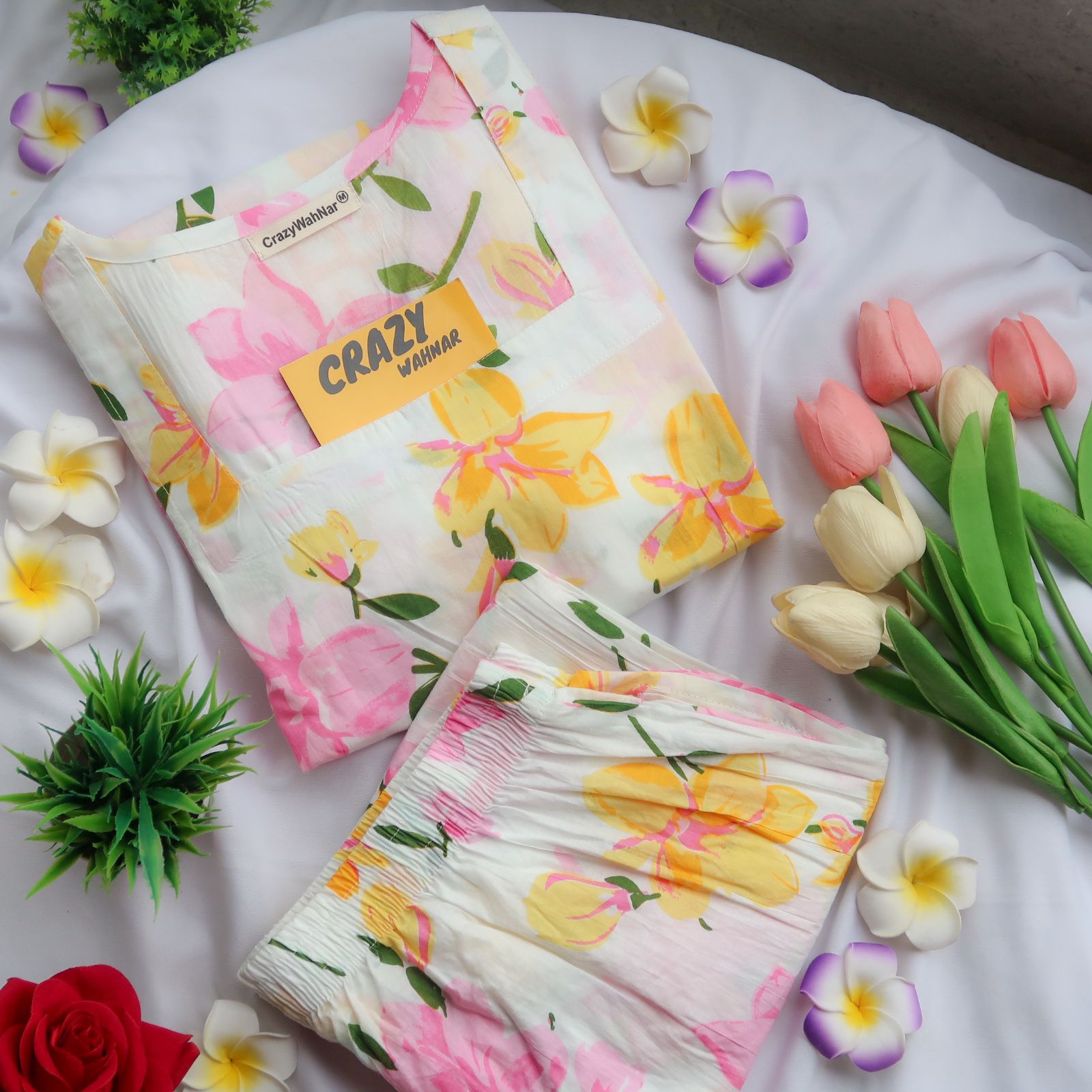 Matching seamlessly with the top, the wide-leg pants mirror the same white base adorned with the delightful pink and yellow lilies and green leaves print. Made from pure cotton for softness and breathability, these pants offer both style and practicality with pockets on both sides.