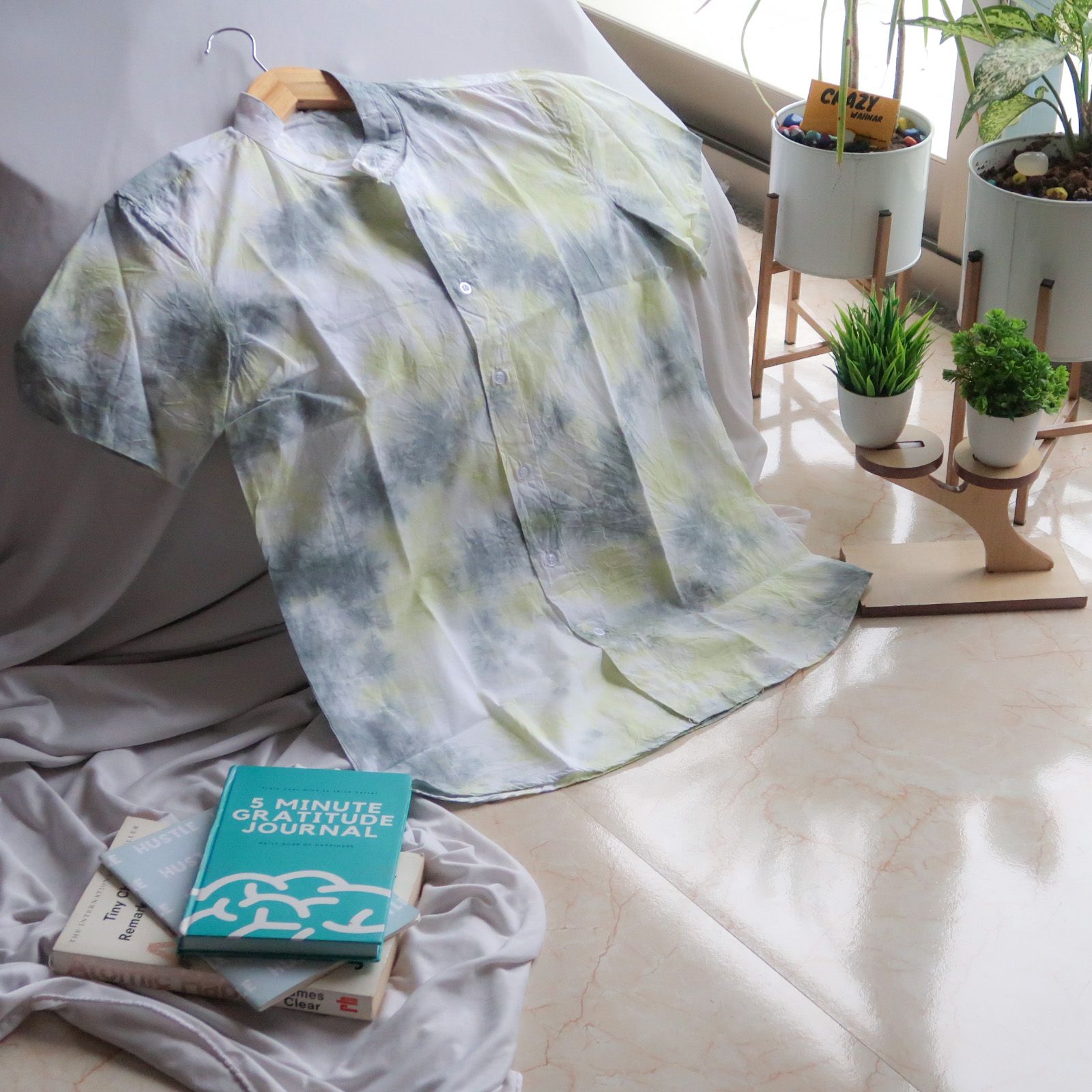 The tie-dye mixture print combines shades of green and greyish tones, creating a unique and artistic effect. The organic blending of colors adds depth and visual interest to the shirt, making it a standout piece in any ensemble.