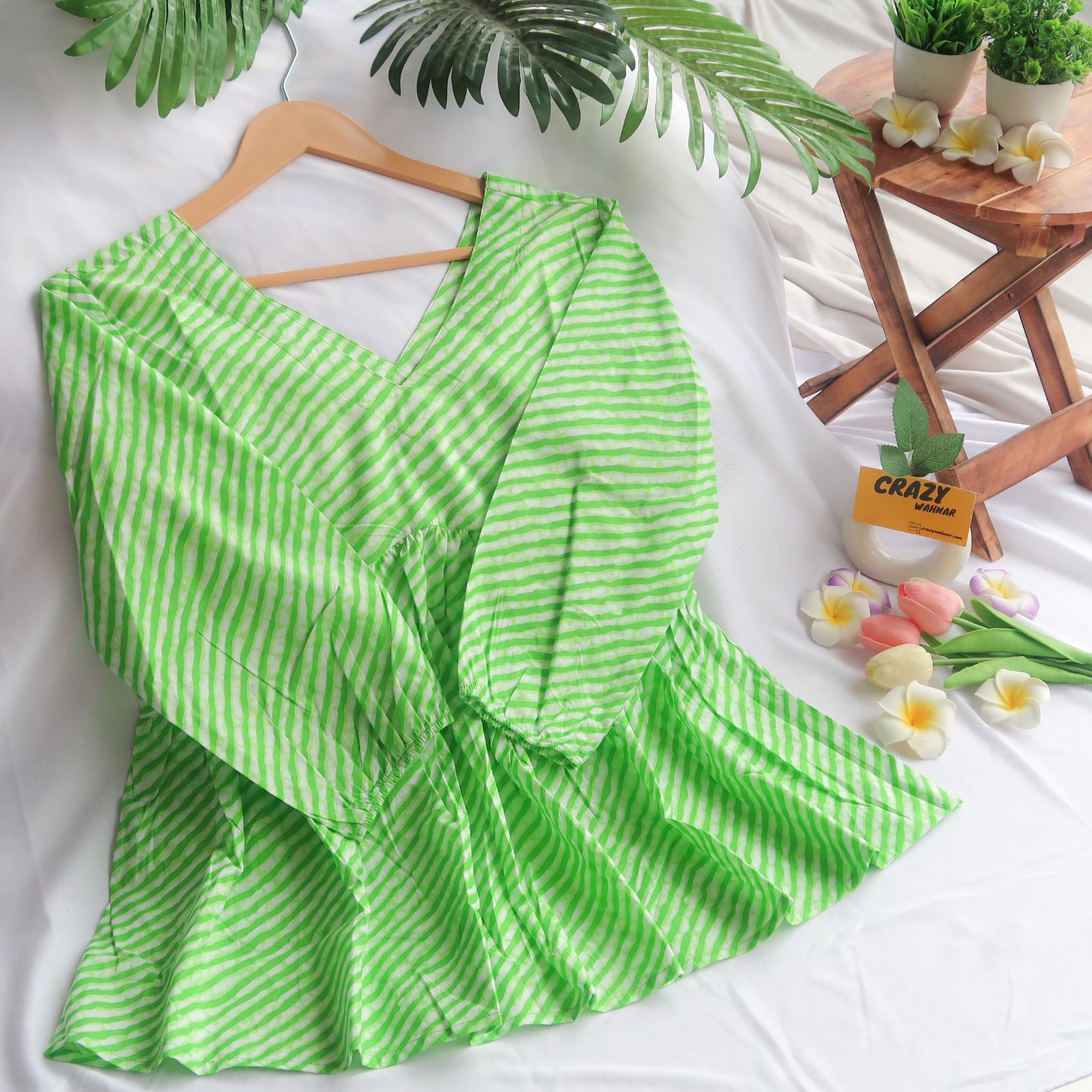 Step into the realm of timeless elegance with our Short Peplum Kurti, where tradition meets contemporary allure. This exquisite piece boasts a flattering V-neckline, designed to accentuate your neckline with grace and sophistication. Adorned in the mesmerizing leheriya print, intertwined with refreshing green and white stripes, it captures the essence of heritage craftsmanship in a modern silhouette.
