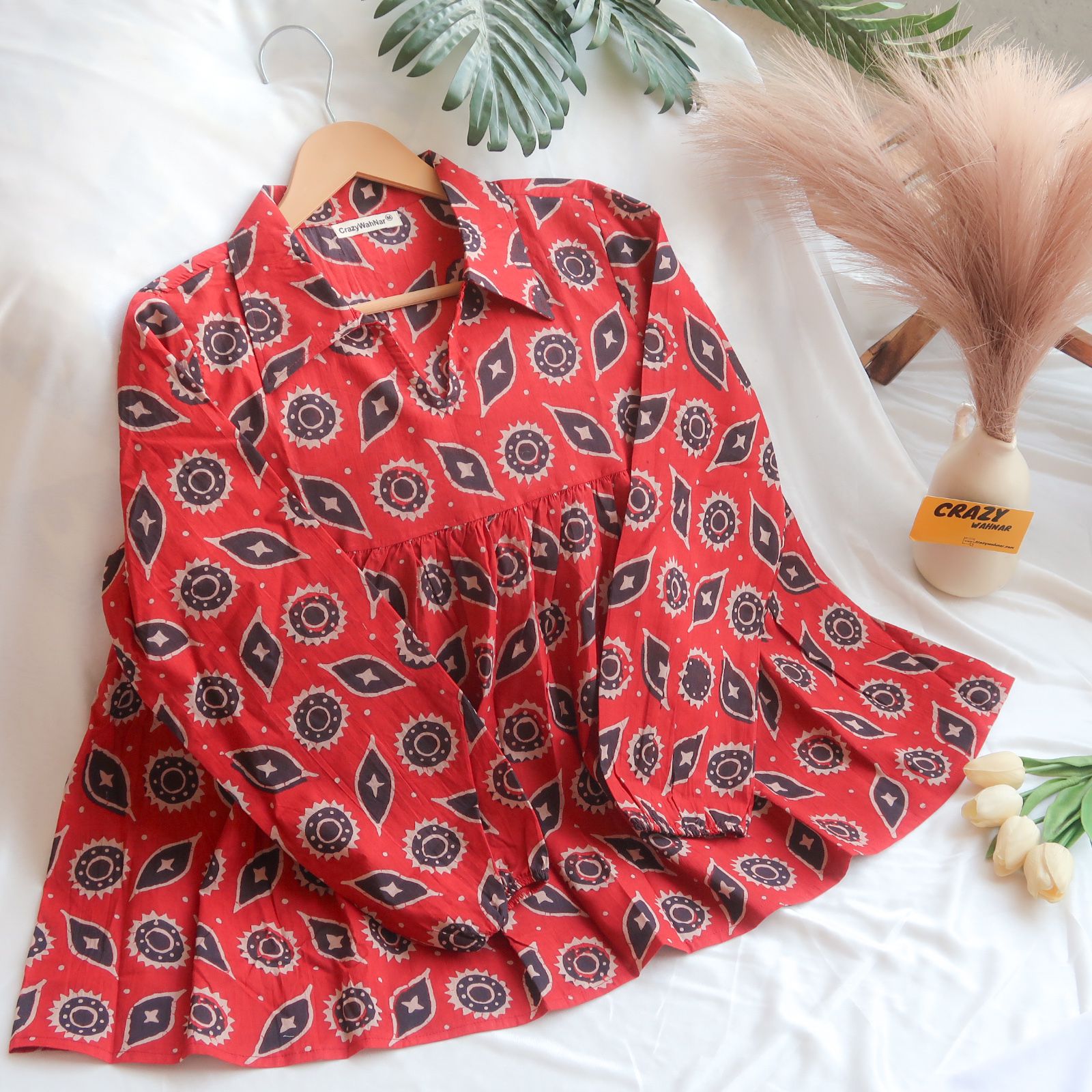 This pure cotton peplum top showcases a rich dark red maroon base, elegantly accented with striking black motifs that create a bold and fashionable statement. The stylish collar neck and full balloon sleeves add a touch of sophistication and comfort, perfect for any occasion.