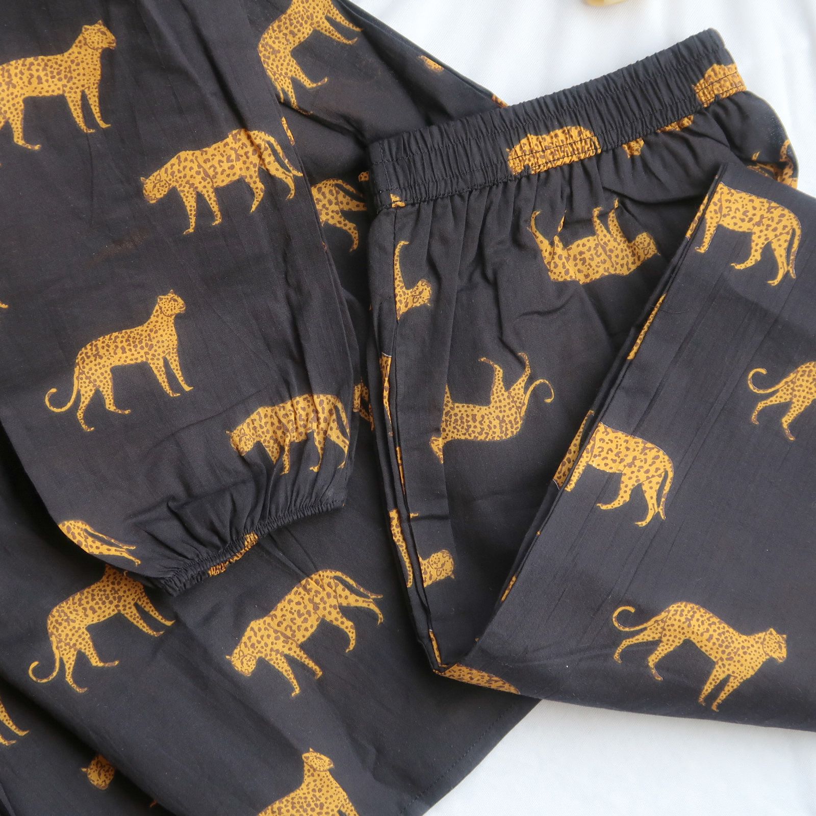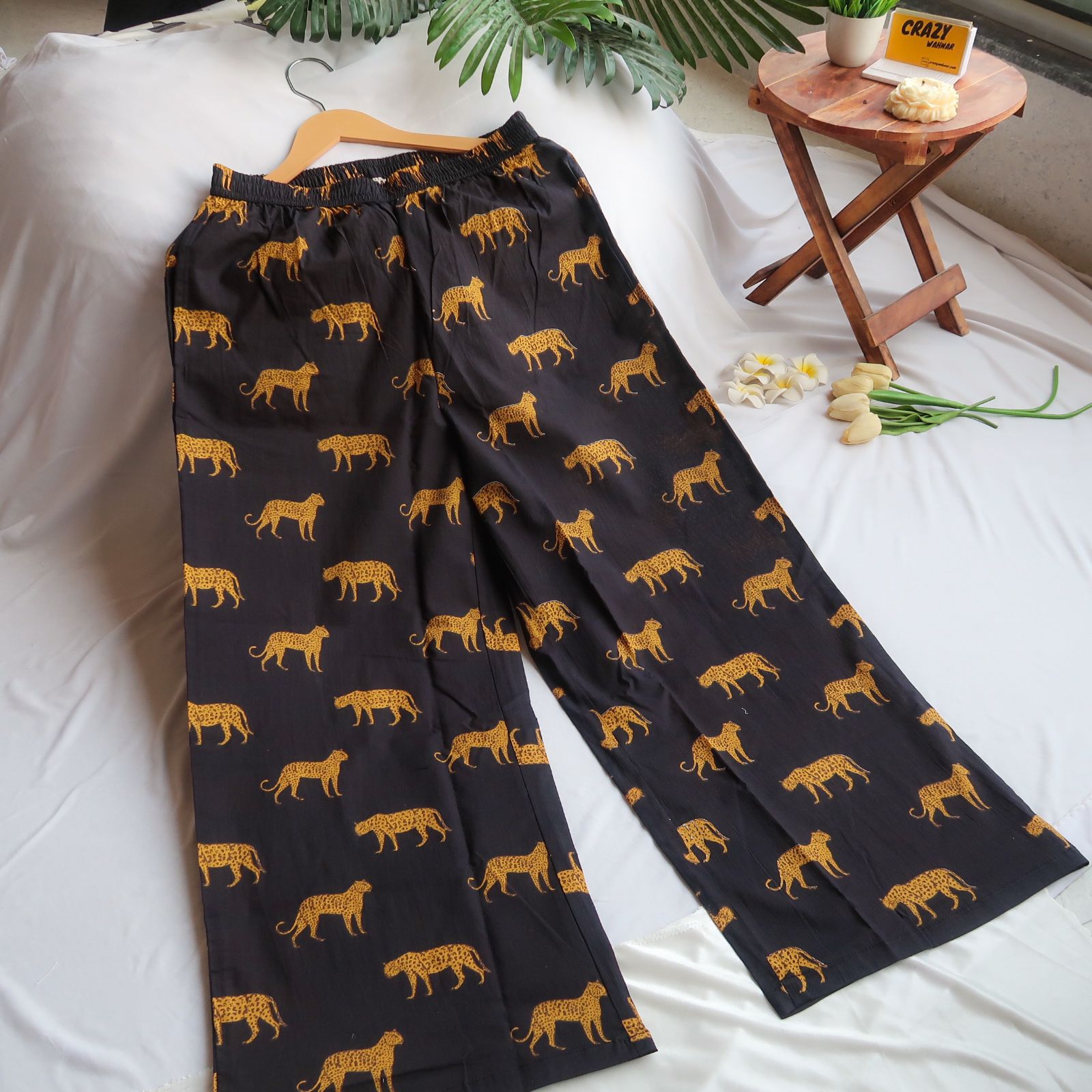Paired with matching black palazzo pants,this set ensures a cohesive and fashionable appearance. The palazzos are adorned with the same vibrant yellow tiger print and are designed with convenient side pockets, combining functionality with flair.