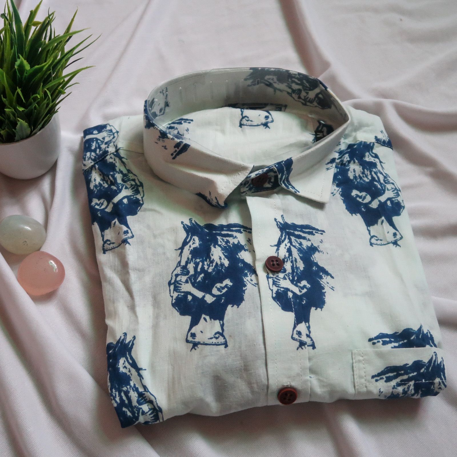 It is a Unisex printed pure cotton slim-fit shirt is a summer must-have. It is having a regular collar, 1 pocket, full sleeves.