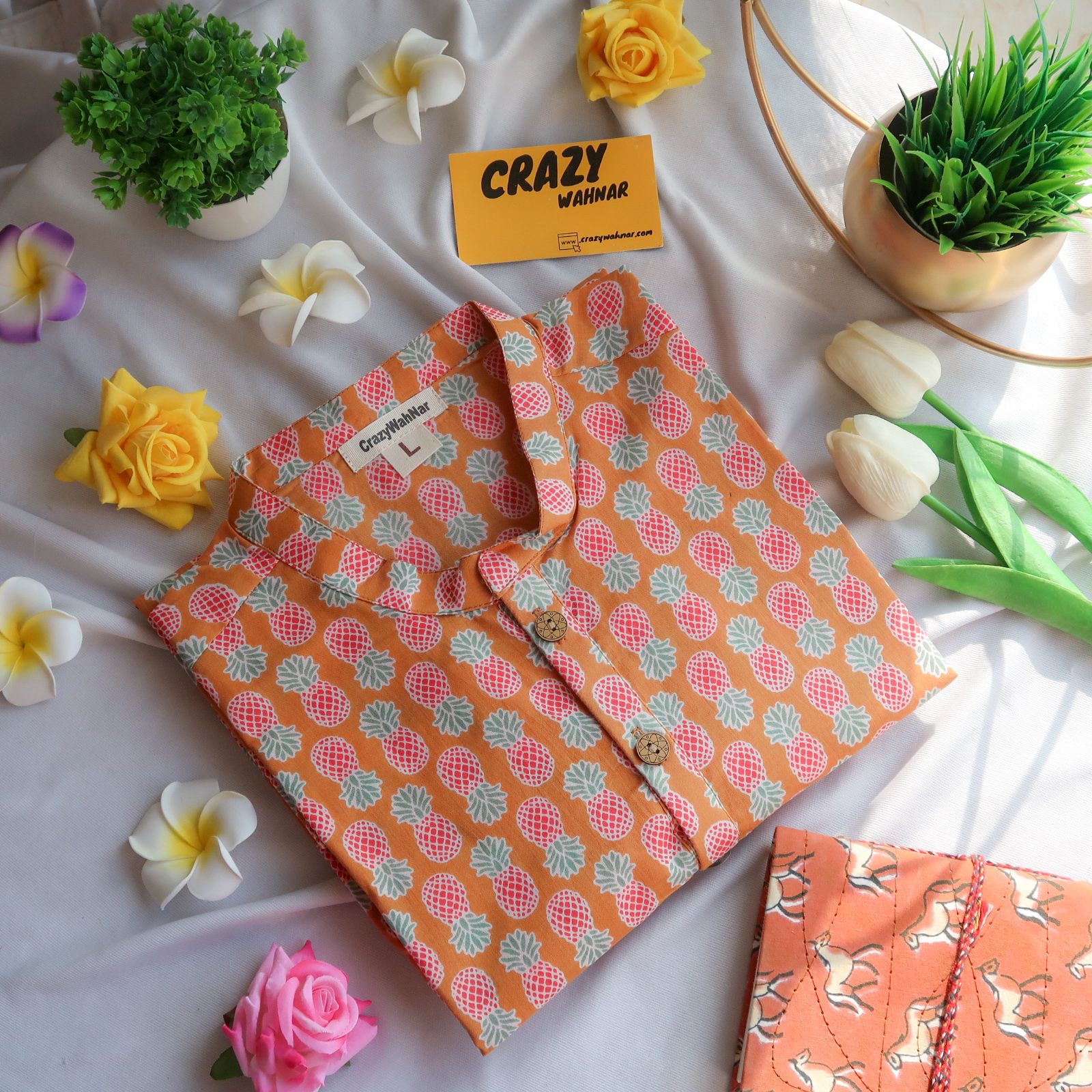 Introducing our men's long cotton kurta, a burst of tropical charm in a refreshing light orange hue adorned with playful pink and green pineapple prints. Immerse yourself in unparalleled comfort with its breathable fabric and full sleeves, while the practical addition of both side pockets adds a touch of functionality. This kurta is a versatile choice, effortlessly transitioning from casual occasions paired with jeans to festive celebrations when styled with ethnic pajamas. Embrace the vibrant spirit of the tropics with this comfortable and stylish ensemble, perfect for making a statement at any gathering or celebration.