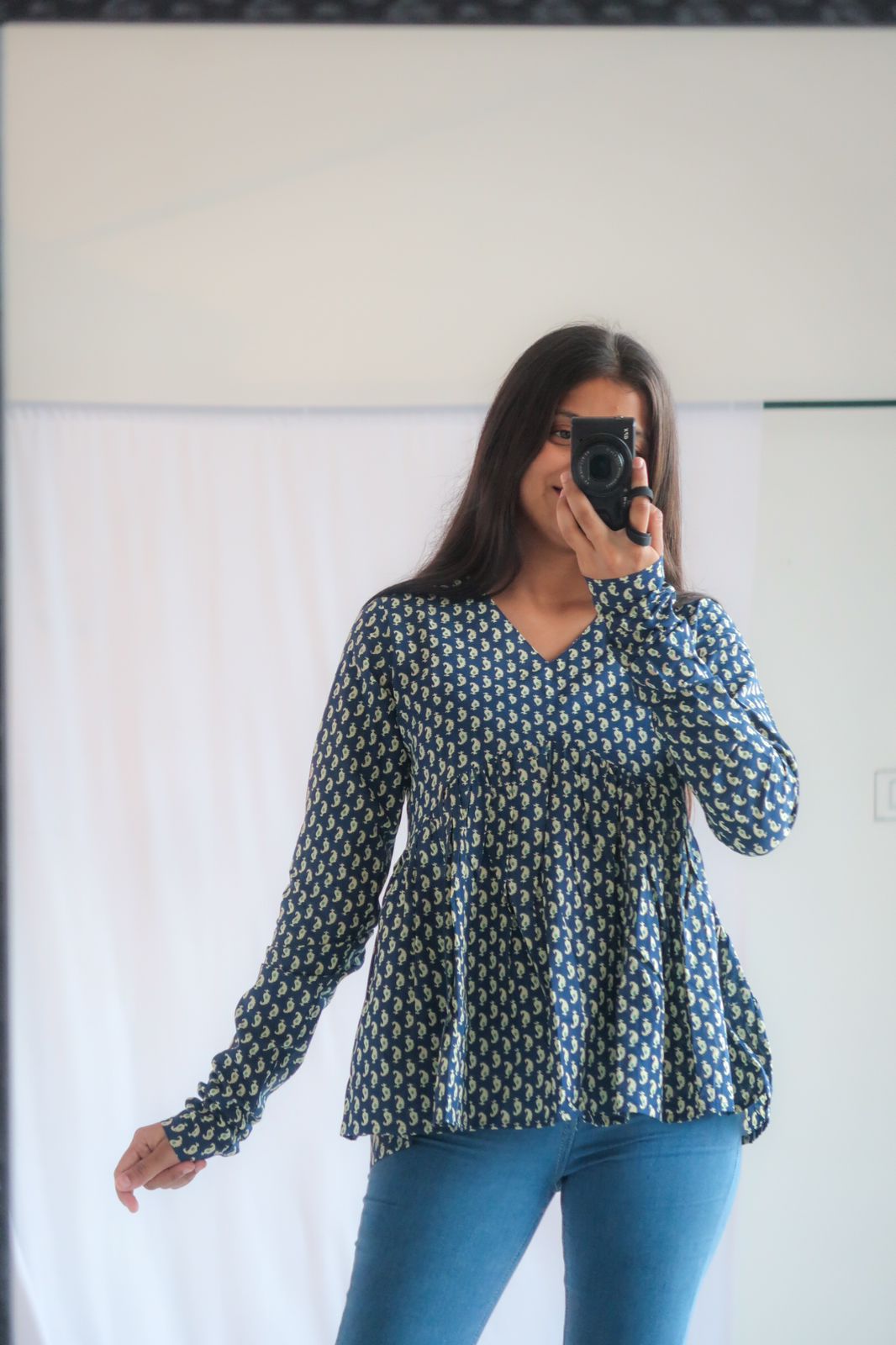 Discover timeless elegance with our Barbie Churidar Short Kurti, featuring a rich navy blue base adorned with delicate cream-colored kerry motifs. This sophisticated design combines traditional charm with modern flair, thanks to its flattering V-neckline and the graceful pleats above the waist that create a subtle, flowing flare.