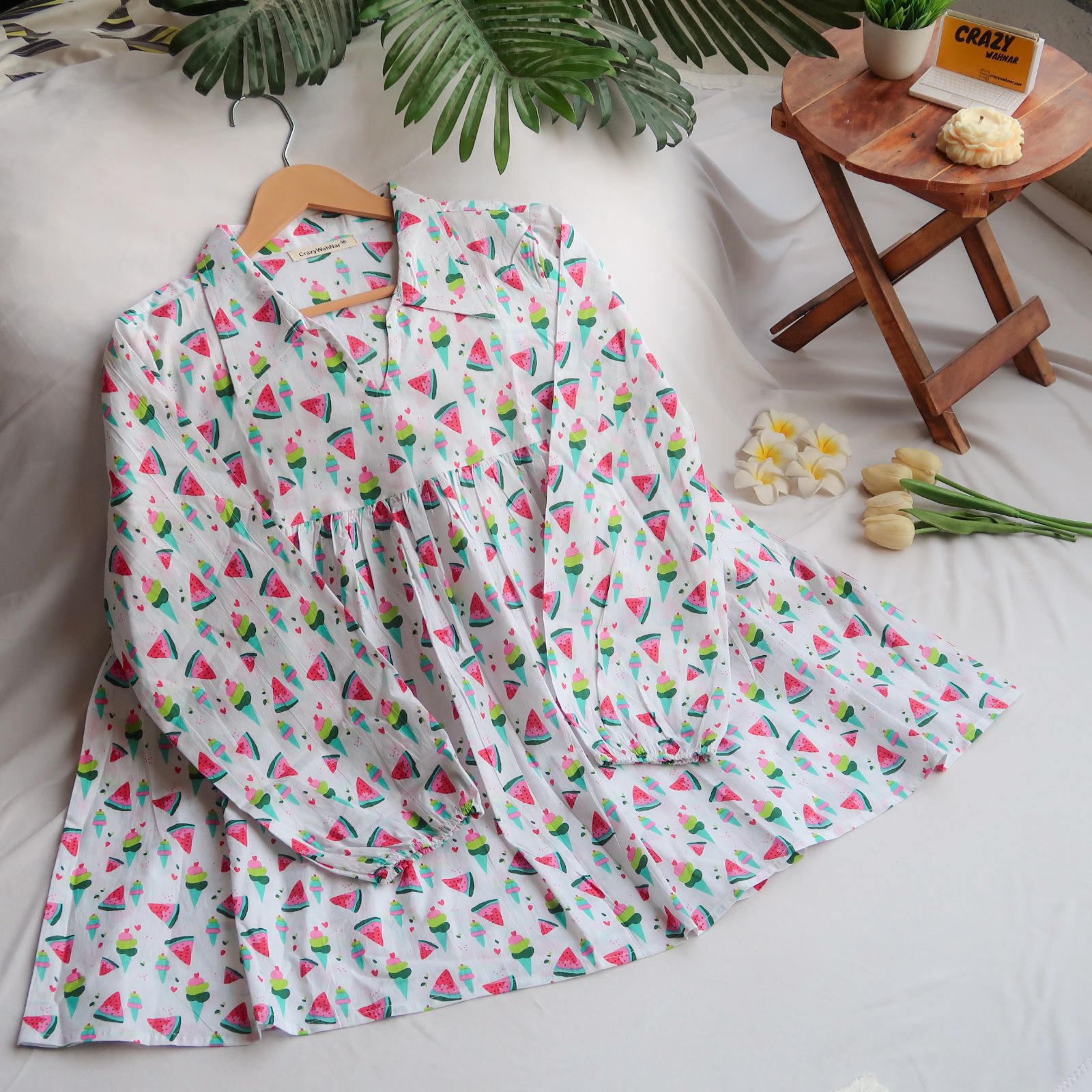 Infuse a splash of fun into your wardrobe with this playful pure cotton coord set, perfect for sunny days. The white peplum top, adorned with vibrant prints of chopped watermelons and colorful ice creams, is a delightful ode to summer vibes. The collared neckline and balloon full sleeves add a chic and feminine flair to this breezy design.